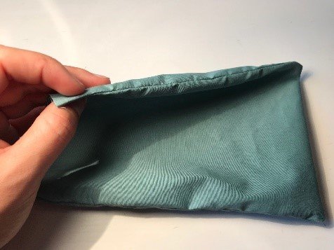 Nun kann man das Getreidekissen durch die Lasche mit dem Überzug beziehen.