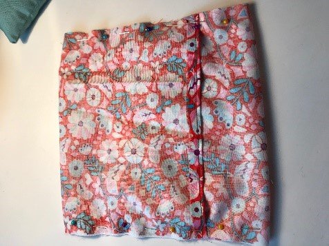 Nun die Ränder der offenen Seite einschlagen, mit Stecknadeln befestigen und zusammennähen.