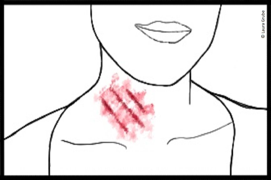 Es gibt aber auch eine lustige Anekdote zu dem Thema. Mit etwa 19 Jahren war meine Neurodermitis nicht besonders stark ausgeprägt. Die Stellen befanden sich überwiegend an Hals und Armbeugen. An einem Freitagabend stand ich mit meinen Freund*innen in der Schlange zur Disco. Nun war ich an der Reihe, der Türsteher wollte meinen Ausweis sehen. Ich gab ihm den Ausweis und er fragte mich mit ernster Stimme: „Hat dich da ein Vampir gekratzt?“ Ich wusste gar nicht, wovon er spricht, bis er grinsend auf meinen Hals deutete. Es wurde noch ein sehr lustiger Abend, doch das Gespräch werde ich nie vergessen. Er meinte es damals nur lustig, und in dem Moment fand ich es auch lustig. Trotzdem wollte ich nach diesem Abend nie wieder blutige Haut haben. Geschafft habe ich das nicht, aber gebe mir immer wieder Mühe.
